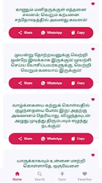 このアプリの主な特徴の1つは、「今日の引用」機能で、毎日モチベーションのあるタミル語の引用を通知して、ユーザーを一日中インスピレーションを与えることです。さらに、ユーザーは簡単にタミル語の特定の引用を検索したり、後で使用するために引用をクリップボードにコピーしたり、WhatsAppなどの他のアプリでテキストとして引用を共有したりすることができます。アプリでは、ユーザーがお気に入りの引用をマークして、簡単にアクセスしたり将来の参照用にしたりすることもできます。